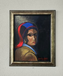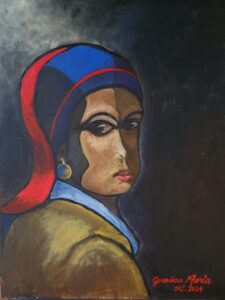I was inspired by the ‘Girl with the pearl’ by Vermeer. I love to learn from the great masters, but I put my own soul in it. I painted this between August – October 2024. I do hope Vermeer won’t hold it against me, how I ‘distorted’ his beautiful girl …