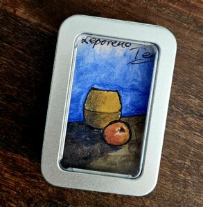 In augustus 2024 heb ik er een geknipt en gevouwen van een A4 schetsboekpagina. Dan heb je een klein harmonicaboekje met 17 mini-pagina’s van 6 x 9 cm. Tussen augustus en half oktober ’24 heb ik op elke pagina een minischilderijtje gemaakt. Wat een werk, maar hoe leuk om te doen!