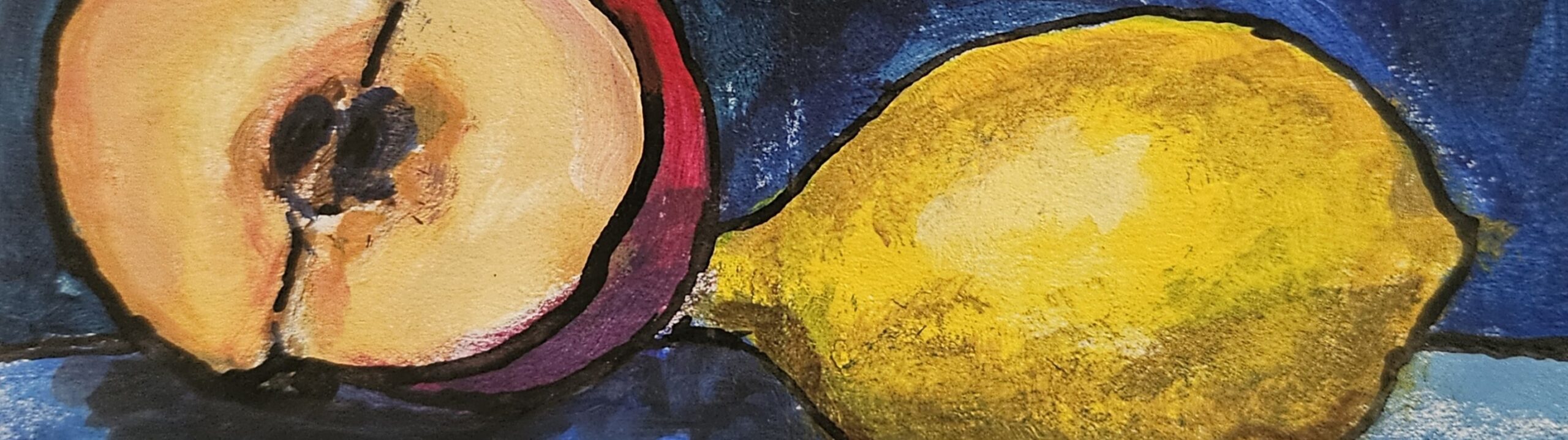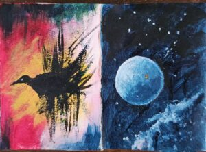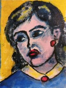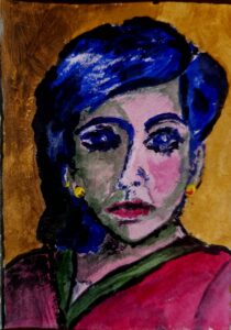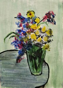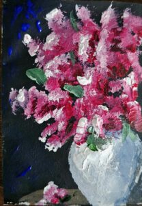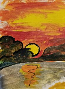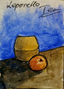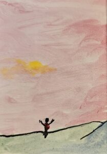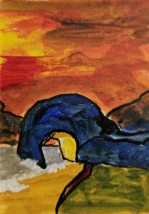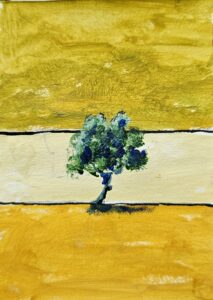 In augustus 2024 heb ik er een geknipt en gevouwen van een A4 schetsboekpagina. Dan heb je een klein harmonicaboekje met 17 mini-pagina’s van 6 x 9 cm. Tussen augustus en half oktober ’24 heb ik op elke pagina een minischilderijtje gemaakt. Wat een werk, maar hoe leuk om te doen!